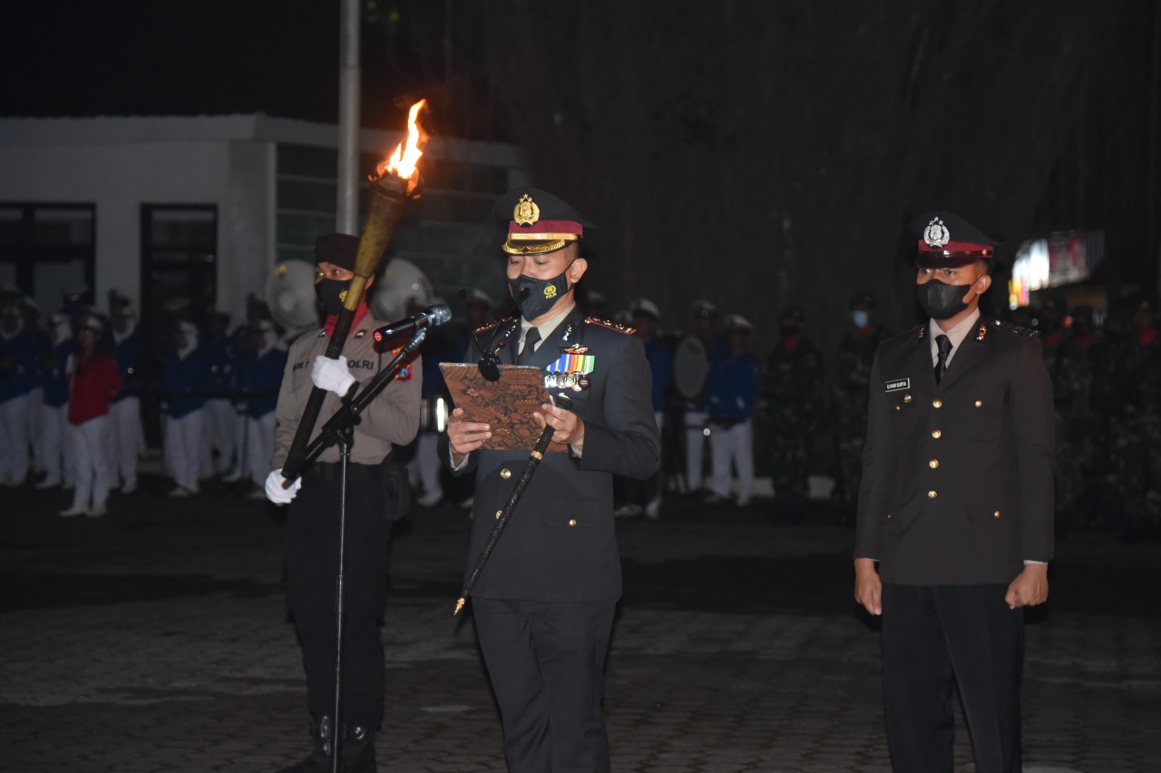 “Kami yang hadir hari ini, Rabu tanggal 17 Agustus 2022 pukul 00.00 WIB, pada upacara memperingati Hari Kemerdekaan ke-77 Republik Indonesia serta memperingati jasa-jasa para pahlawan yang telah gugur demi memperjuangakan Kemerdekaan NKRI, “ucap Kapolres Bondowoso.