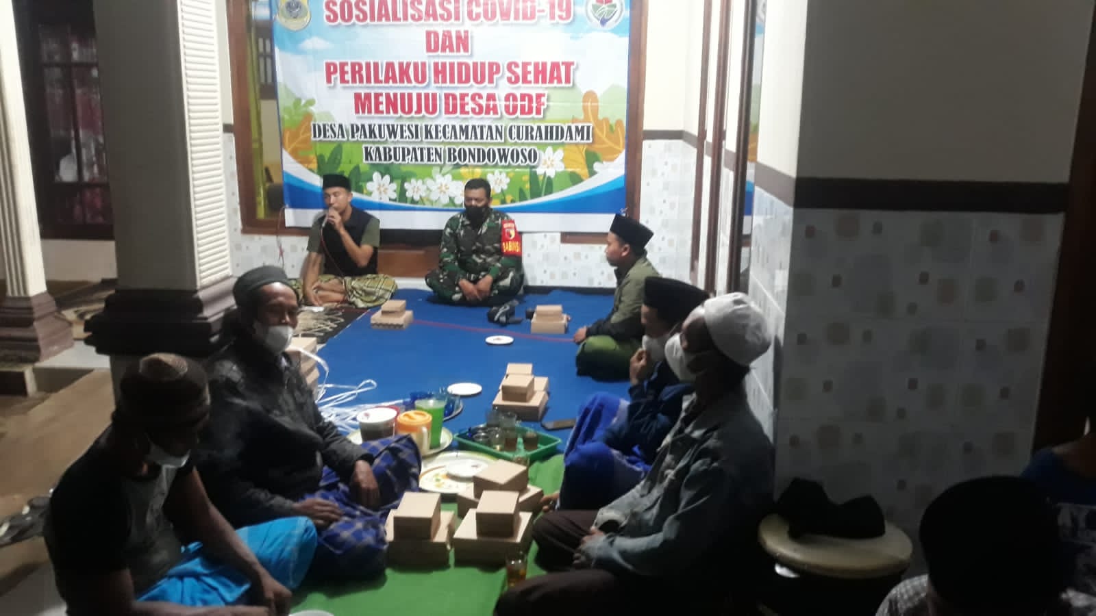 Sertu M. Amin Sujarno Babinsa Desa Pakuwesi Koramil 0822/02 Curahdami Kodim 0822/Bondowoso melaksanakan kegiatan Komunikasi Sosial (Komsos) dengan Aparat Desa Di wilayah Binaan dalam rangka Sosialisasi Covid-19 Dan Perilaku Hidup Sehat Menuju Desa ODF bertempat di Kantor Desa Pakuwesi kecamatan Curahdami Kabupaten Bondowoso, Selasa (20/09/2022).