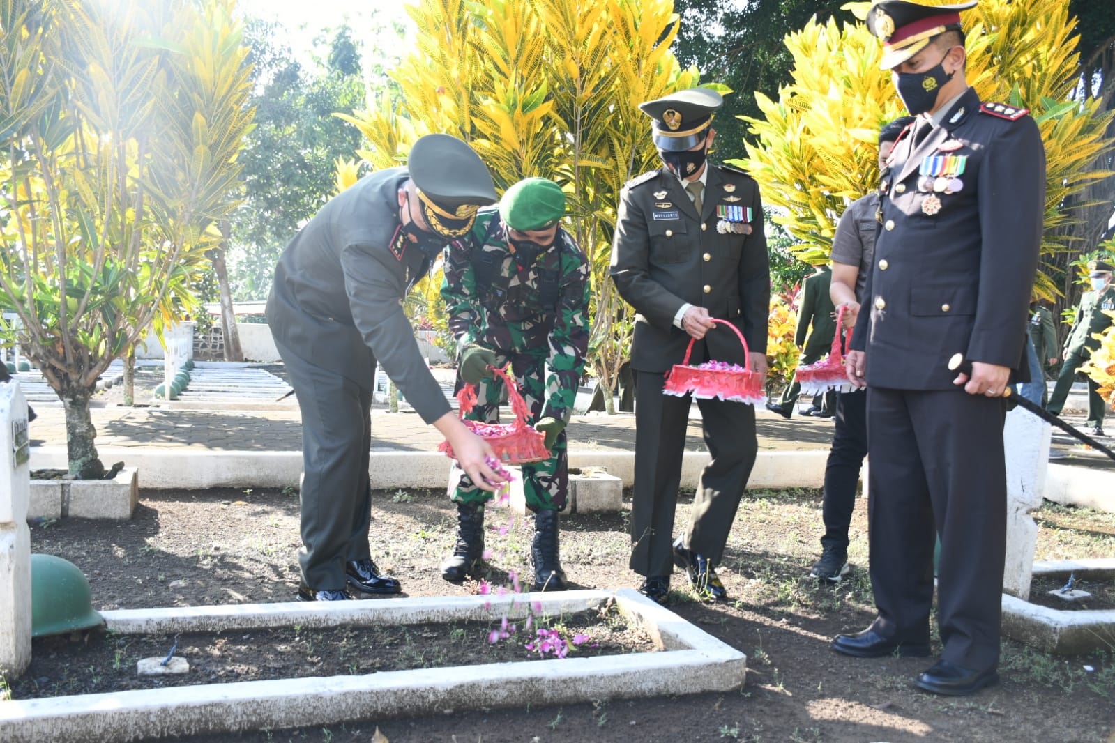 Rangkaian Upacara Ziarah Nasional menyambut HUT ke-77 TNI diakhiri dengan tabur bunga di Taman Makam Pahlawan yang diawali oleh Irup dan diikuti oleh peserta upacara. ( rd )