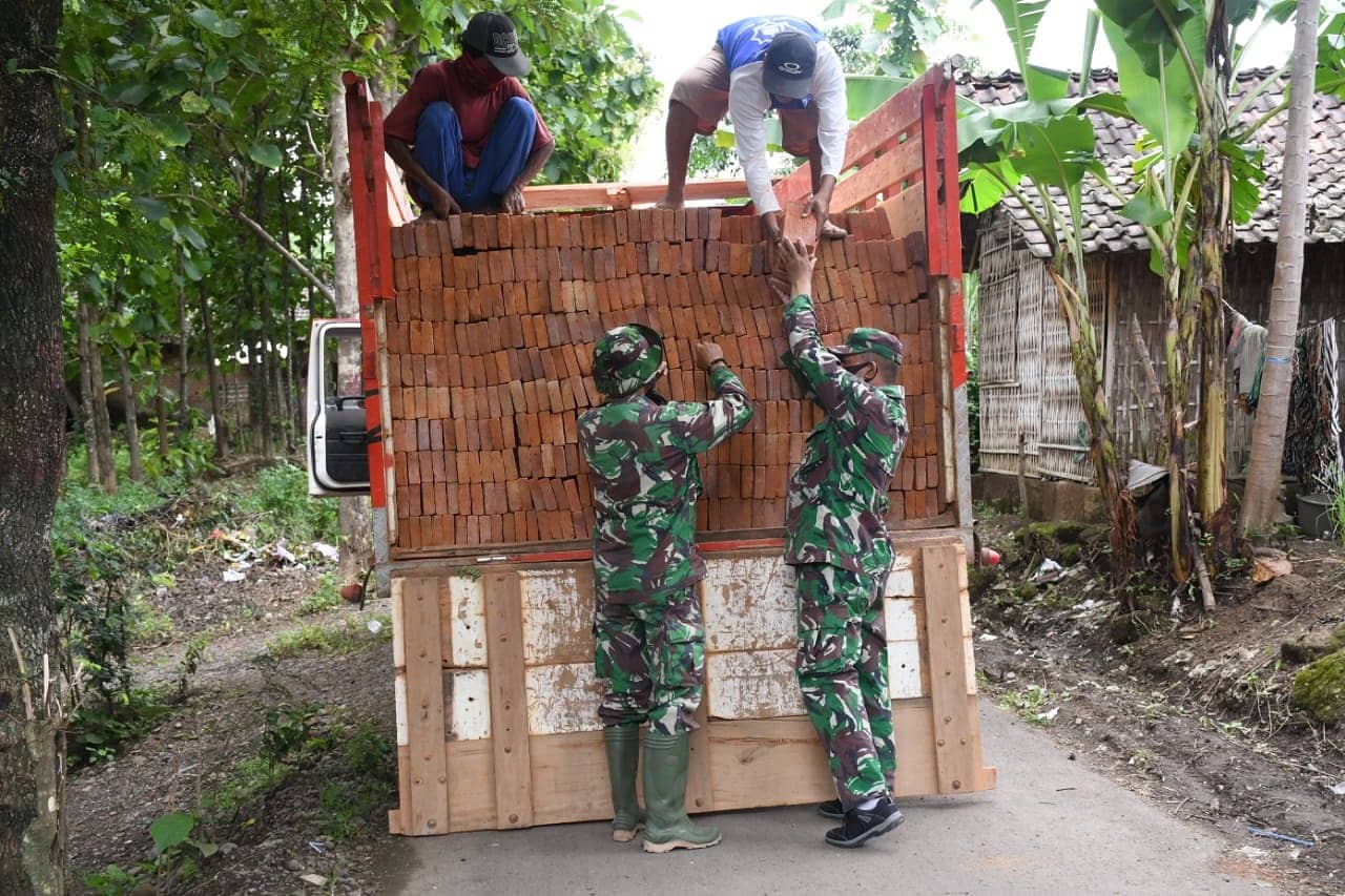 ”Disaat semua sibuk bekerja, dan tiba-tiba dropping material sampai di lokasi, tak ada istilah menunggu tenaga dari orang lain. Kebetulan saya yang agak longgar, Batu Bata itu saya “angkat”,” ujar Babinsa Kopka Pujiono.