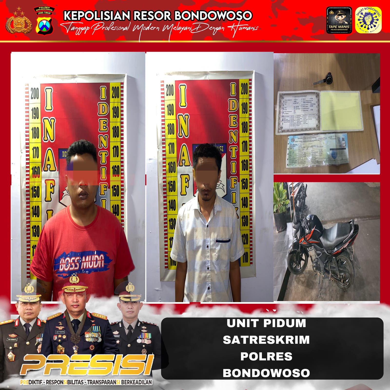 Keterangan tersebut disampaikan oleh Kapolres Bondowoso AKBP Wimboko, SIK melalui Kasat Reskrim Polres Bondowoso AKP Agus Purnomo, SH. MH, “Sat Rekrim telah berhasil mengamankan 2 Pelaku yang diduga melakukan pencurian sepeda motor,” ungkap Kasat Reskrim Polres Bondowoso.
