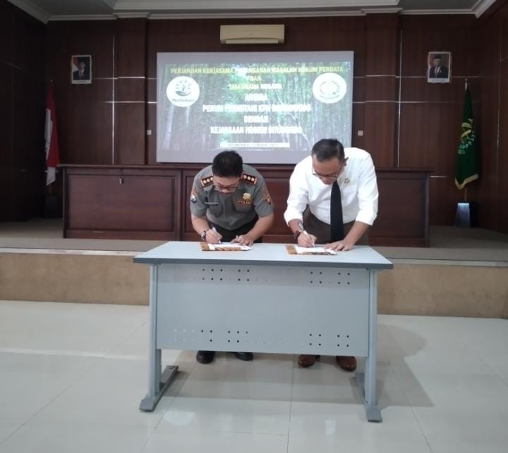 Situbondo, KLIKTODAY.CO.ID – Bertempat di aula Kejaksaan Negeri Situbondo hari ini Jumat 17/3/22 Andi Adrian Hidayat Administratur Perum Perhutani Bondowoso menandatangani perjanjian kerjasama penanganan masalah hukum Perdata dan Tata usaha Negara (TUN) dengan Nauli Rahim Siregar SH.MH Kepala kejaksaan negeri (Kajari) Situbondo, Tampak hadir dan ikut mendampingi Administratur Perhutani diantaranya segenap wakil adm, segenap kepala seksi (Kasi) dan segenap Asper/KBKPH khusus wilayah hukum kabupaten Situbondo