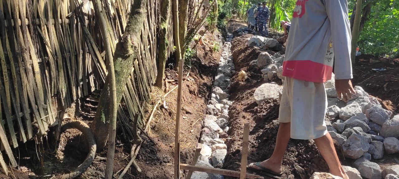 Seperti Sertu Rifan personel tergabung dalam Satgas TMMD dari TNI AL Lanal Banyuwangi mengarahkan Personil Satgas untuk membaur bersama warga membantu mengangkut paving block untuk pengerasan permukaan jalan desa.