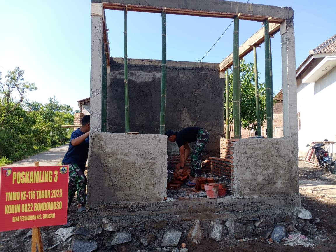 “Pembangunan Poskamling yang dibangun di lokasi strategis, tepat berada di pertigaan Simpang jalan menjadi sasaran rehab Satgas TMMD ke 116 sudah mencapai 35%,” ujar Pasiter Kodim 0822 Bondowoso Kapten Arm Yonaidi D.