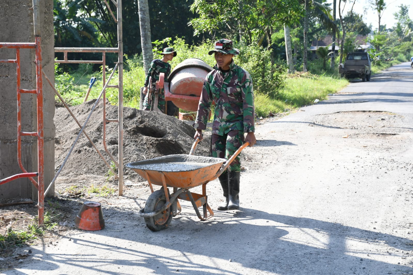 Serka Usman salah satu personel satgas TMMD ke 116 terlihat bersemangat bergotong royong dengan warga mengangkut material dirapatkan ke lokasi pembangunan gapura.