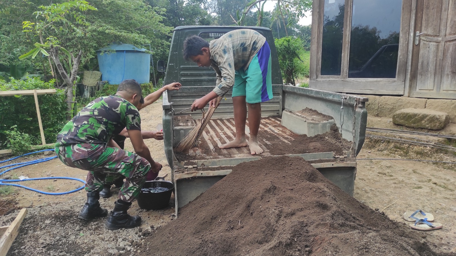 Nampak terlihat beberapa anggota Satgas TMMD dan anak-anak Desa Kerang sangat senang, Itulah moment tepat Kopda Hendra dan Aruk untuk membawa material oleh kendaraan pickup milik Kodim 0822, untuk merapikan segala pekerjaan sasaran fisik.