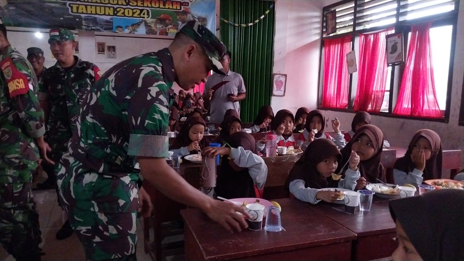 Keceriaan Tampak Jelas mewarnai halaman sekolah dan ruangan SD N2 way Mengaku. dengan kehadiran para TNI di Sekolah tersebut. Membuat anak-anak tampak bersemangat dan Antusias menyantap Makanan Khas ala TNI.