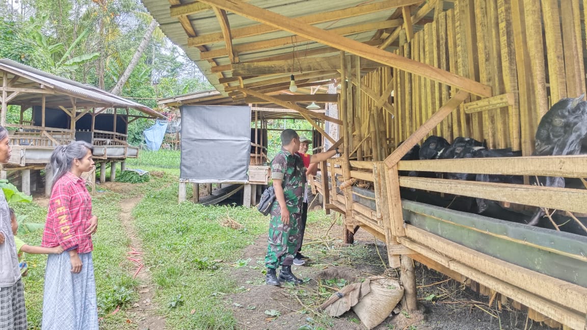 Babinsa Koramil 0822/13 Tlogosari Kodim 0822 Bondowoso Koptu Lukman S. melaksanakan Komunikasi Sosial (Komsos) dengan menyambangi salah satu peternak hewan Kambing di Desa binaan yang berlokasi di Dusun Krajan Rt. 03 Rw. 01 Desa Trotosari Kecamatan Tlogosari Kabupaten Bondowoso, Rabu (21/2/2024).