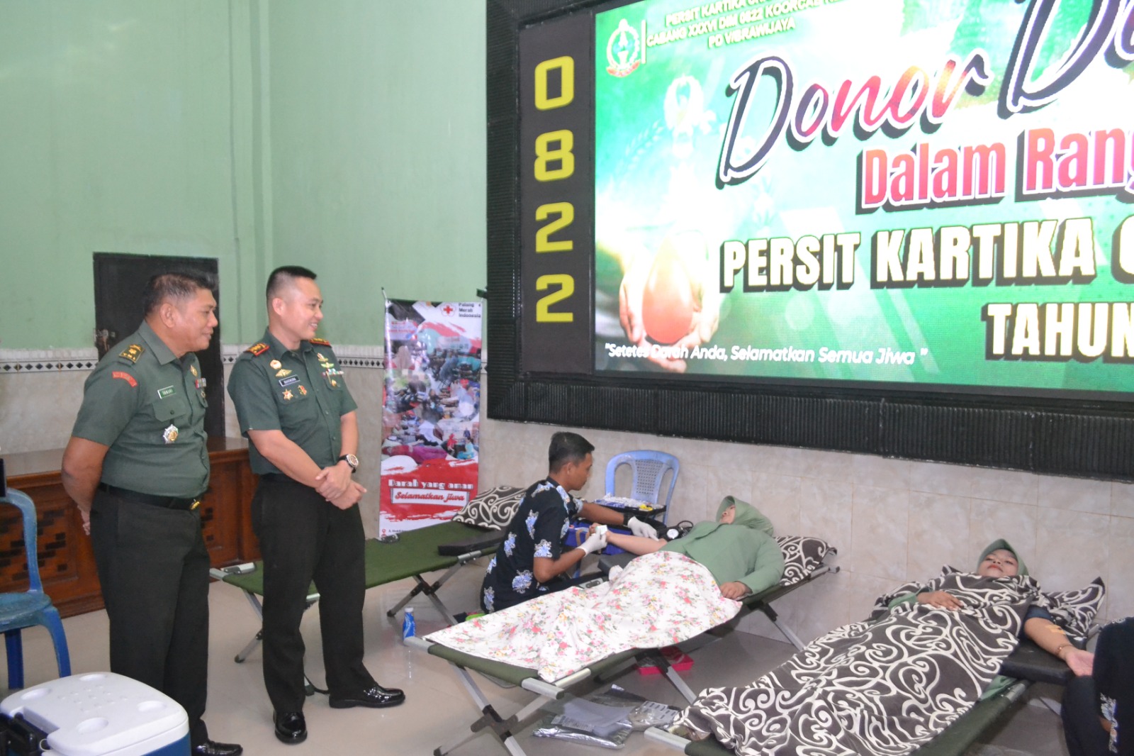 Dalam rangka memperingati Hari Ulang Tahun (HUT) Persit Kartika Chandra Kirana Ke-78 Tahun 2024 Kodim 0822/Bondowoso bekerjasama dengan PMI Bondowoso menggelar kegiatan donor darah bertempat di aula Jenderal Sudirman Makodim 0822, Jalan Letnan Sutarman No 06 Bondowoso, Jum’at, (1/3).