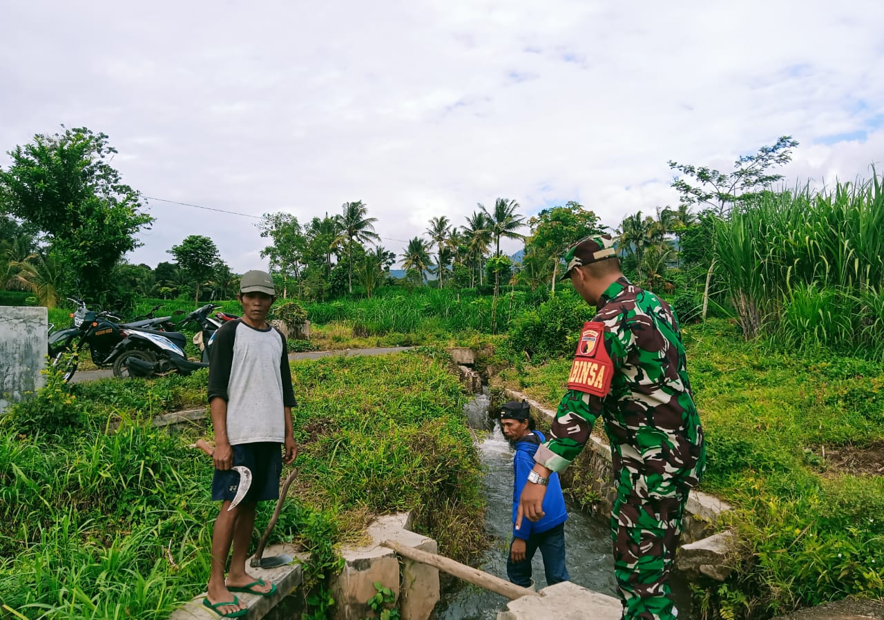 Dalam rangka mengatasi kesulitan masyarakat, Babinsa Koramil 0822/08 Grujugan Kodim 0822/Bondowoso Koptu Alam dan Petani melakukan kegiatan pendampingan pengecekan saluran irigasi sawah di Dusun Giwang Rt. 25 Rw. 05 Desa Dadapan Kecamatan Grujugan Kabupaten Bondowoso, Jum’at (5/4).