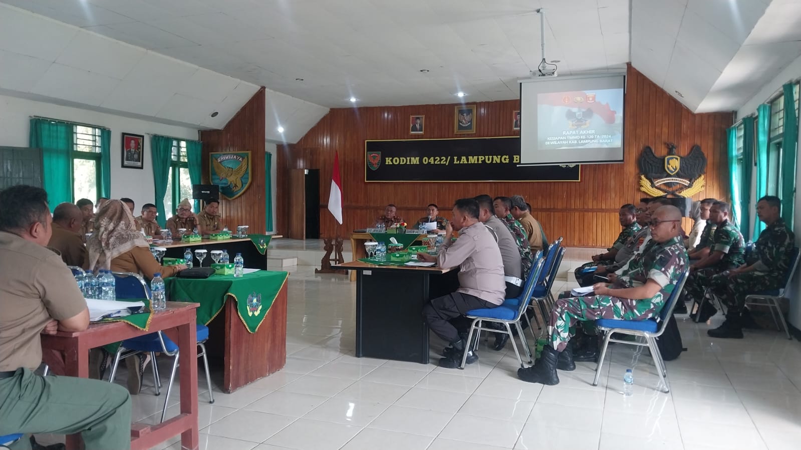 Komandan Kodim (Dandim) 0422/Lampung Barat Letkol Inf Rinto Wijaya S.A.P., M.I.Pol., M.Han memimpin langsung rapat koordinasi umum kesiapan pelaksanaan TNI Manunggal Membangun Desa (TMMD) Ke-120 TA 2024 di Aula Sudirman MaKodim 0422/Lampung Barat. Senin (06/05/2024)