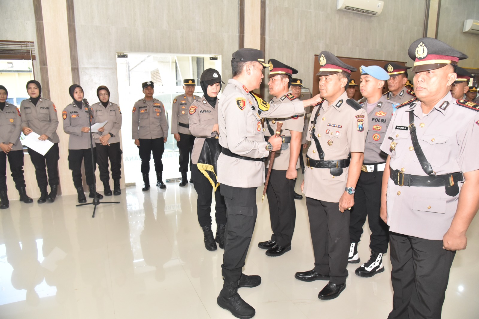 Kapolres Bondowoso AKBP Lintar Mahardhono, SH. S.I.K. M.I.K. memimpin upacara serah terima jabatan (sertijab) 5 Pejabat dilingkup Polres Bondowoso, Selasa 14/05 2024.