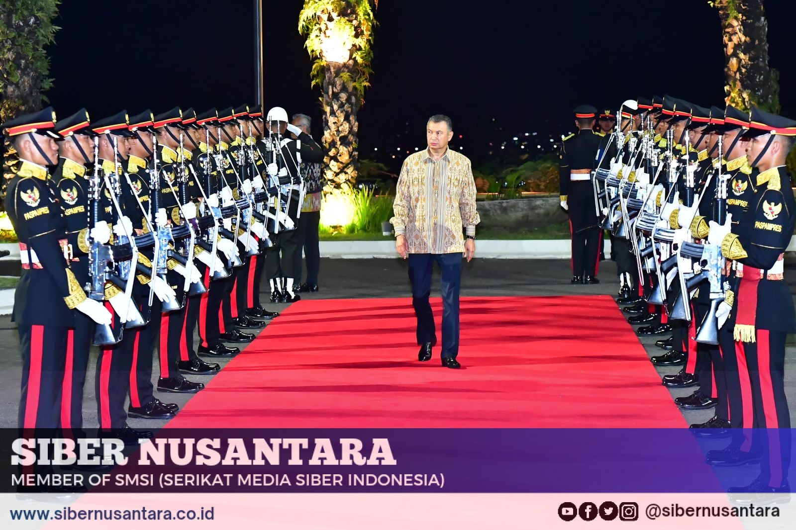 Presiden Jokowi yang mengenakan kemeja kain tenun sintang tiba di GWK, sekitar pukul 18.50 WITA. Presiden Jokowi kemudian menyambut kedatangan para tamu seraya berfoto bersama sebelum memasuki area jamuan.