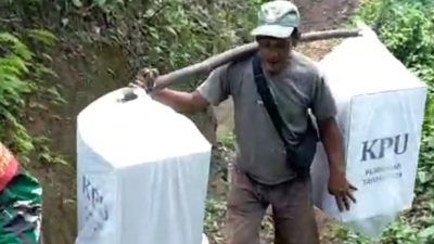 ” Sebenarnya jika mau ada jalur lain yang bisa dilewati sebagai alternatif. Tapi, waktunya untuk mengantar logistik tersebut jauh lebih lama, sekitar lima jam ini melewati jalur yang lebih singkat, meski harus berjalan kaki. Untuk membawa logistik Pemilu itu tim harus berhenti beberapa kali karena lelah. Sebab, mereka harus berjalan sembari memikul kotak-kotak logistik Pemilu, “tambahnya.