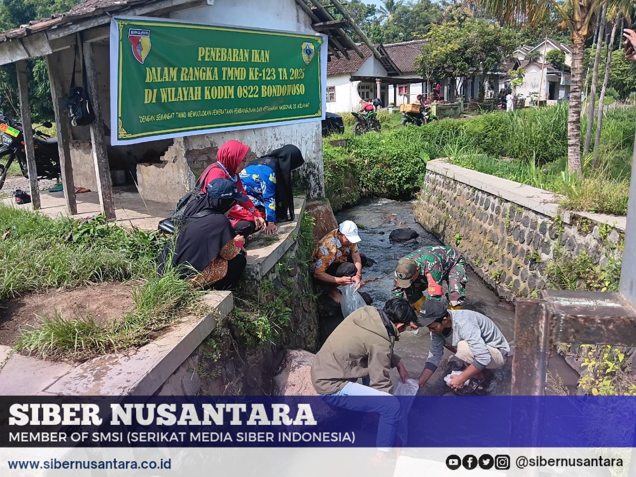 Dalam upaya mendukung ketahanan pangan dan meningkatkan ekonomi warga, Satgas TMMD ke-123 Kodim 0822 Bondowoso bersama Dinas Perikanan menggelar kegiatan penebaran 4.400 benih ikan nila di perairan Desa Trotosari, Dusun Krajan. Kegiatan ini turut dihadiri Babinsa Kopka Lukman, Kepala Desa, serta masyarakat setempat yang antusias menyambut program ini.