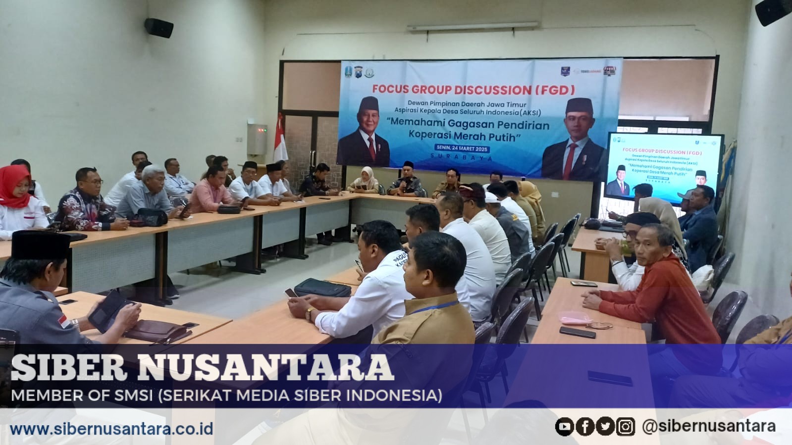Aspirasi Kepala Desa Seluruh Indonesia (AKSI) Provinsi Jawa Timur, menggelar Focus Group Discussion (FGD), bertajuk “Memahami Gagasan Pendirian Koperasi Desa Merah Putih”, di Aula PWI Jawa Timur, pada Senin (24/03/2025).