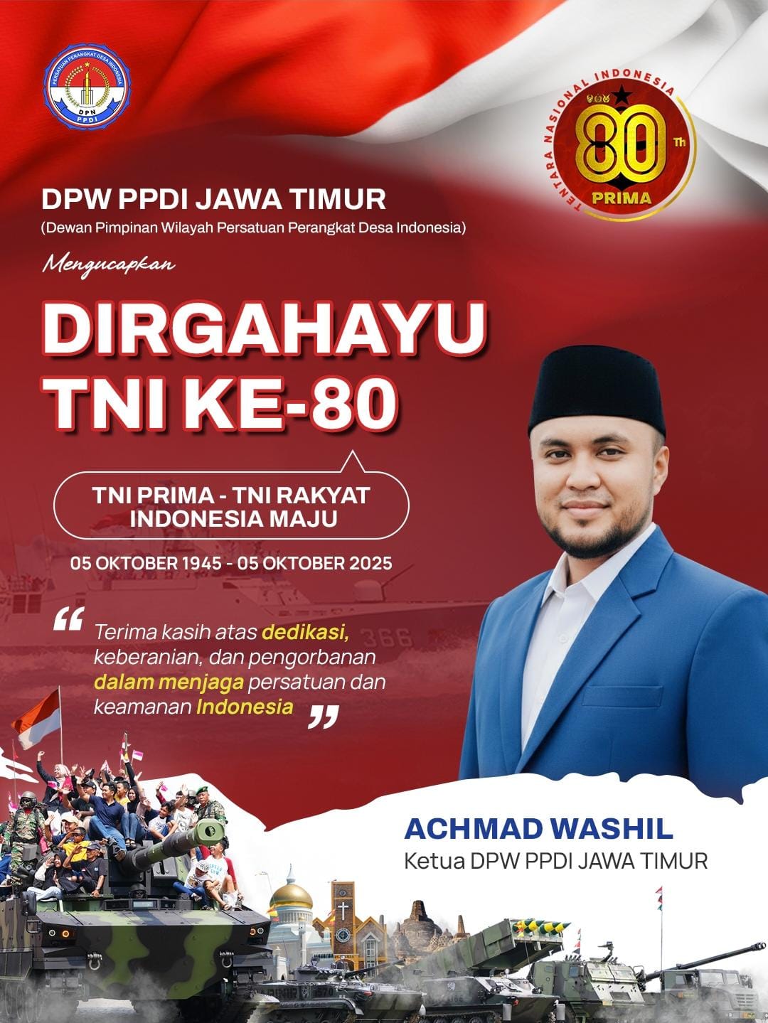 Dalam momentum peringatan Hari Ulang Tahun Tentara Nasional Indonesia (TNI) ke-80, Ketua Dewan Pimpinan Wilayah Persatuan Perangkat Desa Indonesia (PPDI) Jawa Timur, Achmad Washil menyampaikan apresiasi dan ucapan terima kasih yang mendalam kepada seluruh prajurit TNI atas dedikasi, pengabdian, dan keberaniannya dalam menjaga kedaulatan serta keutuhan Negara Kesatuan Republik Indonesia (NKRI).