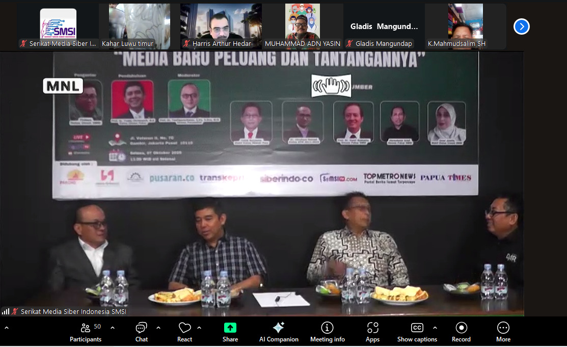 Dialog nasional yang mengambil tempat di Kantor SMSI Pusat, Jalan Vereran, Jakarta, dan diperluas dengan aplikasi zoom berlangsung Selasa, 7 Oktober 2025.