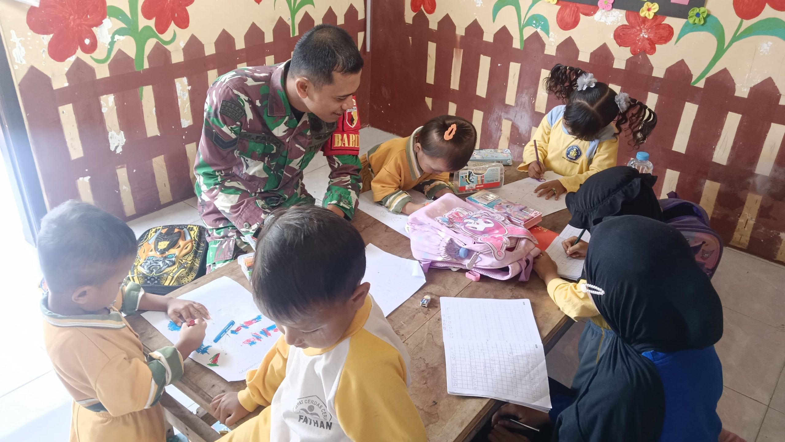 Dalam suasana riang gembira, Sertu Fauzi turut menjadi pendamping belajar sambil mengenalkan pembiasaan karakter kedisiplinan, sopan santun, serta menumbuhkan rasa cinta Tanah Air sejak usia dini. Interaksi langsung bersama anak-anak PAUD juga memberi pengalaman belajar yang menyenangkan sehingga mudah diterima oleh peserta didik.