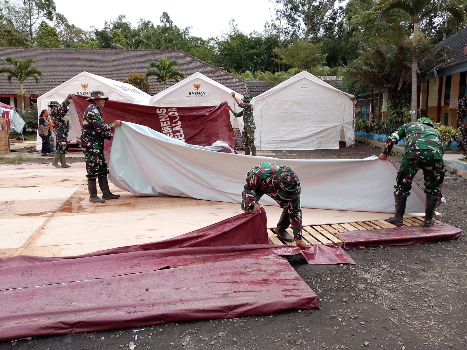 Upaya meningkatkan kenyamanan dan keteraturan di lokasi pengungsian terus dilakukan oleh jajaran TNI bersama relawan. Sebagai koordinator pengungsian di SMPN 02 Pronojiwo, Danramil 07/Randuagung, Kapten Inf Erwin Daud, S.Pd, memimpin langsung kegiatan bongkar pasang dan penataan ulang tenda pengungsi agar lokasi lebih tertata dan siap menerima bantuan.