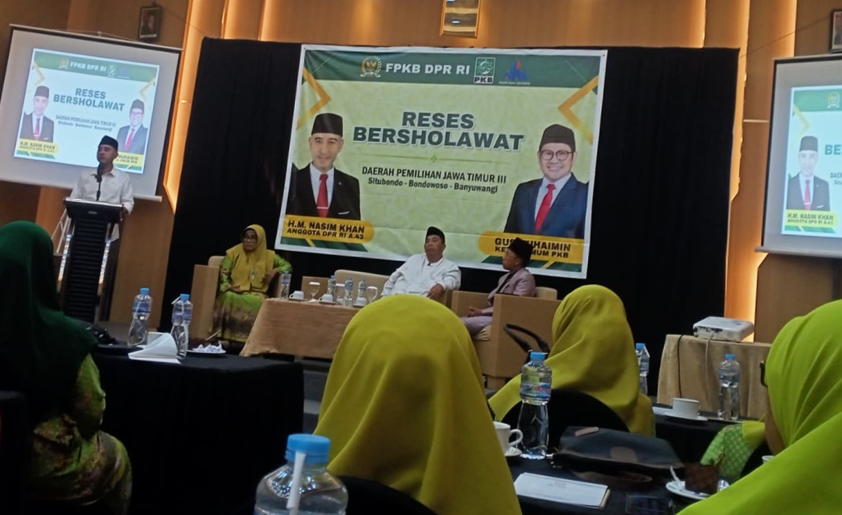 Anggota DPR RI Fraksi Partai Kebangkitan Bangsa (F-PKB), H.M. Nasim Khan, menggelar kegiatan Reses Bersholawat bersama ratusan Muslimat Nahdlatul Ulama (NU) di Hotel Ijen View Bondowoso, Jum’at (19/12/25).