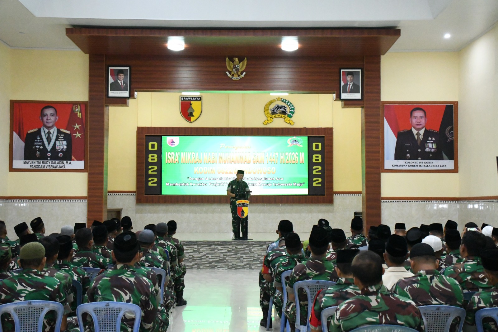 Ratusan prajurit dan PNS Kodim 0822 Bondowoso mengikuti peringatan Isra Mi’raj Nabi Muhammad SAW 1447 Hijriah/2026 M yang digelar di Aula Jenderal Sudirman Makodim 0822 Bondowoso, Jumat, 23 Januari 2026. Kegiatan keagamaan ini berlangsung khidmat dan penuh makna sebagai upaya memperkuat keimanan sekaligus pembentukan karakter prajurit TNI.