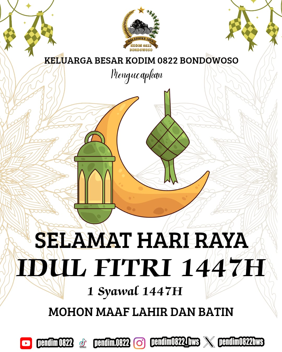 Beranda Nasional Kodim 0822 Bondowoso Mengucapkan Selamat Hari Raya Idul fitri 1447 H TNI, Nasional Kodim 0822 Bondowoso Mengucapkan Selamat Hari Raya Idul fitri 1447 HEditor SNMaret 20, 2026Maret 20, 2026 Keluarga Besar Kodim 0822 Bondowoso BACA JUGA :Dandim 0822 Dan Forkopimda Bondowoso Hadiri Launching Platform Socio ForestBaca JugaPemdes Bendoarum Bersama Warga Gotong Royong Perbaiki Jalan Rusak di Dusun Lamparan BaratPemcam Klabang Satukan Kades dan Instansi Lewat Halal BihalalAksi Joget Karyawan SPPG Lojajar Bondowoso Disorot DPR RI, Nasim Khan: Harus Ada Pembinaan dan KetegasanHeboh Video Joget di Dapur MBG Lojajar, LPRI Jatim Desak Evaluasi TotalJoget di Dapur SPPG Lojajar Viral, Publik Soroti Etika dan Profesionalitas Layanan Gizi di BondowosoDandim 0822 : Keamanan Lebaran Harga Mati